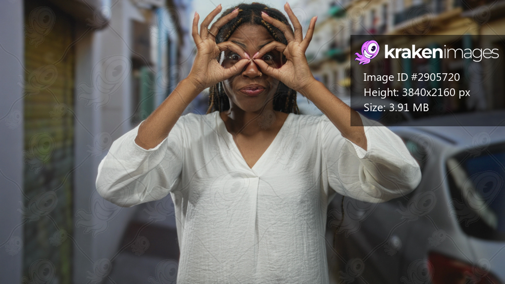 Woman framing her eyes with fingers in hand binoculars gesture on a narrow urban street lined with parked cars and colorful buildings; playful joy.