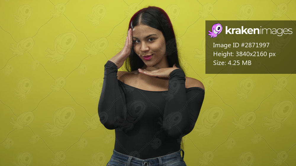 Woman framing her face with one hand on temple and one hand under chin in a yellow studio; confidence.