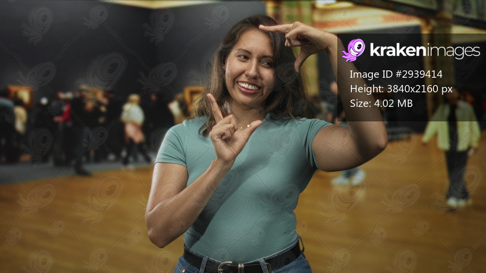 Woman framing scene with hands in gallery building, smiling and posing amid art visitors; playful curiosity.