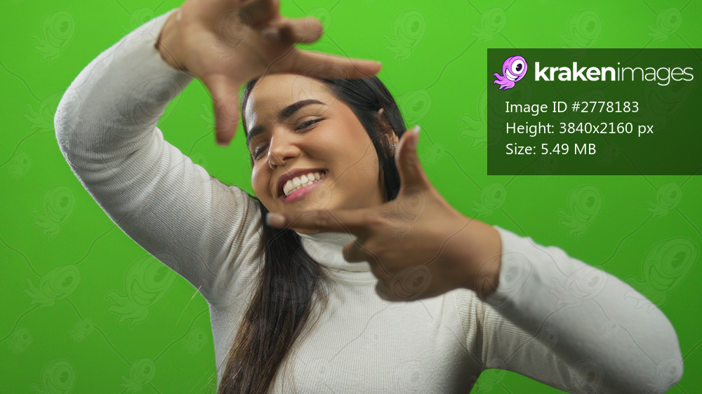 Woman framing shot using hands while smiling against vibrant green background showcasing creativity and focus with her enthusiastic and playful attitude. - Kraken Images
