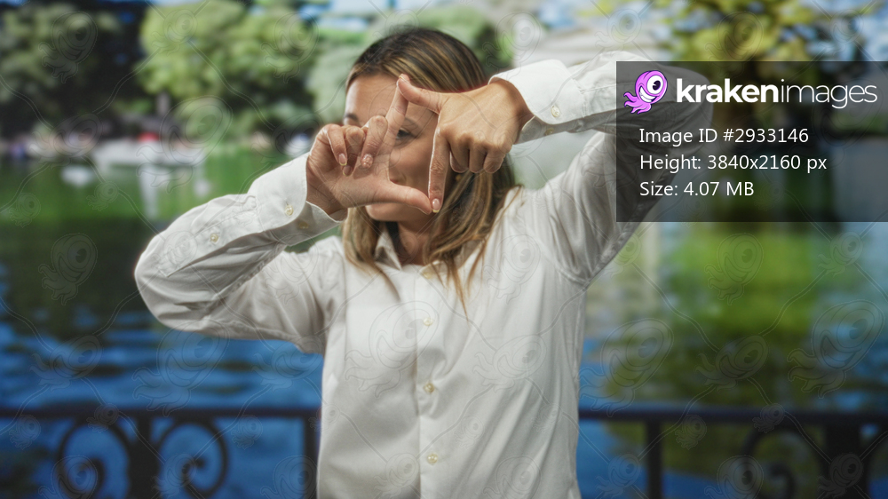 Woman framing view with hands and fingers making a rectangle gesture in park by lake railing; playful curiosity.