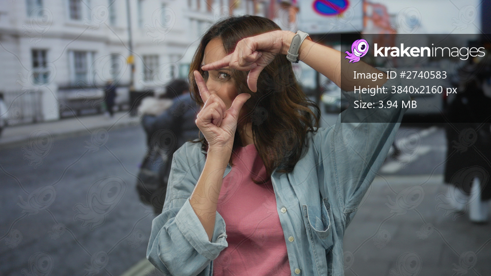 Woman framing view on city street with buildings in background, focused and thoughtful, wearing casual outfit, exploring vibrant urban environment, capturing moment with imagination. - Kraken Images