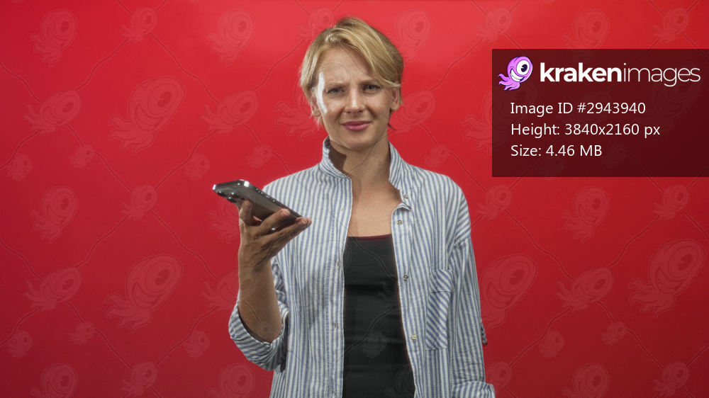 Woman frowning at smartphone, holding device in right hand, squinting and tilting head, striped shirt visible, posed against a red studio backdrop; frustration. - Kraken Images