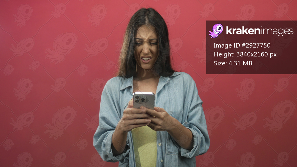 Woman frowning at smartphone while holding device with both hands and pressing thumbs on the screen in a pink studio; frustration.
