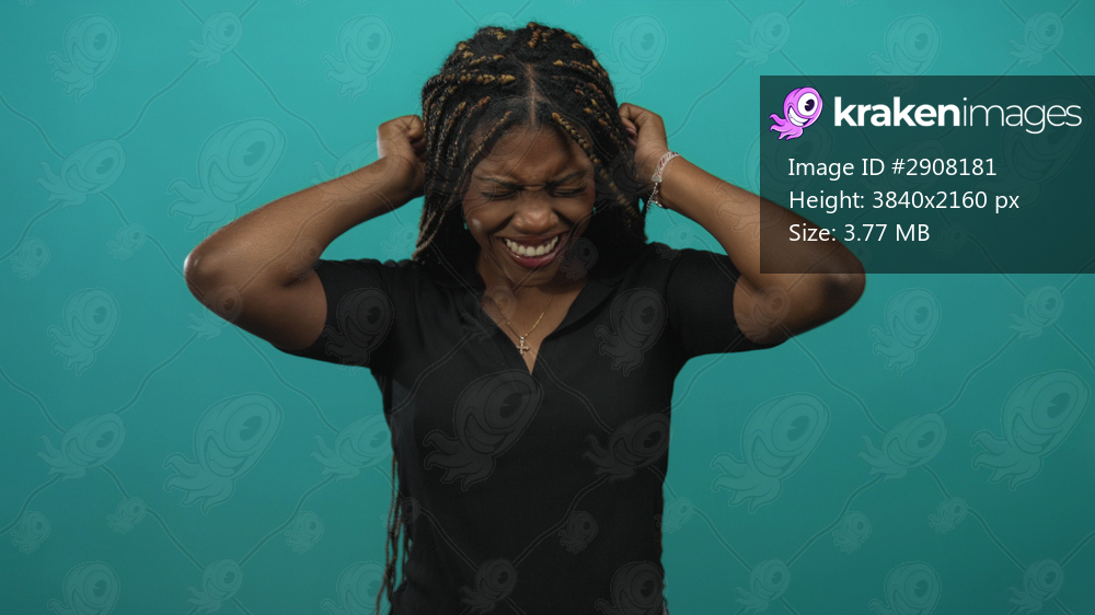 Woman with frowning face, braided hair, nose ring and raised blurred hands in a teal studio wearing a black polo top; frustration resilience.