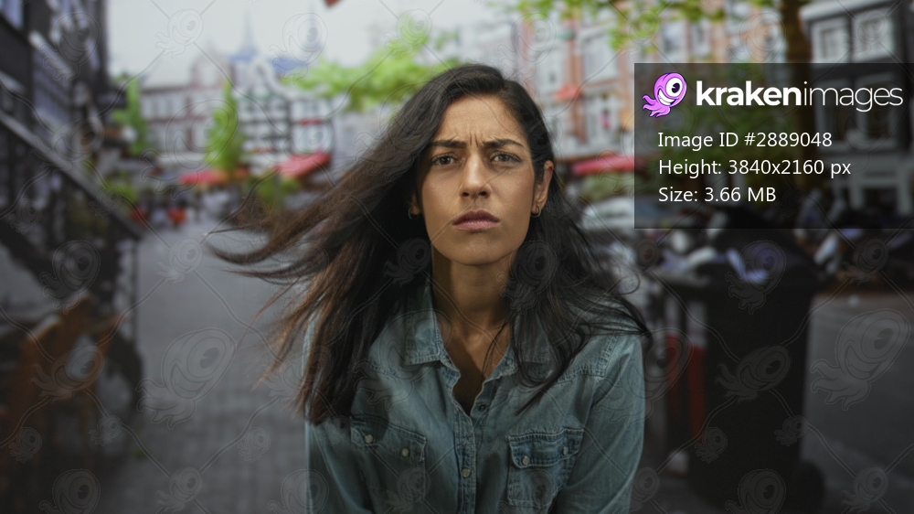 Woman frowning face, hair windblown, wearing denim shirt, leaning forward and staring at camera on a city street with cafes and cobblestones; frustration resilience. - Kraken Images