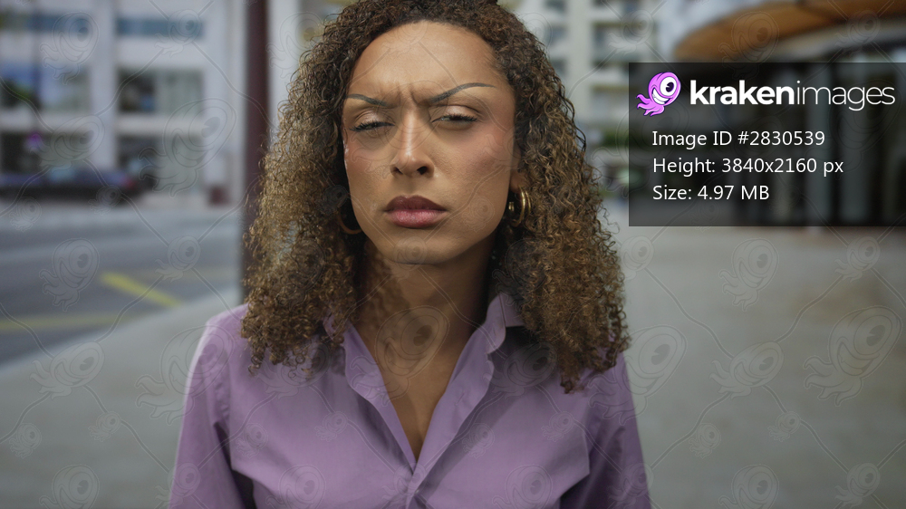 Woman frowning face and knitted eyebrows in city street scene on sidewalk with urban buildings visible under daylight; frustration.