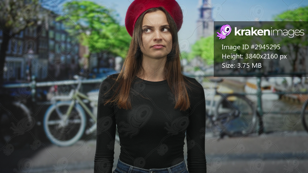 Woman frowning face on street wearing red beret with bicycles and canal buildings in amsterdam; annoyance travel.
