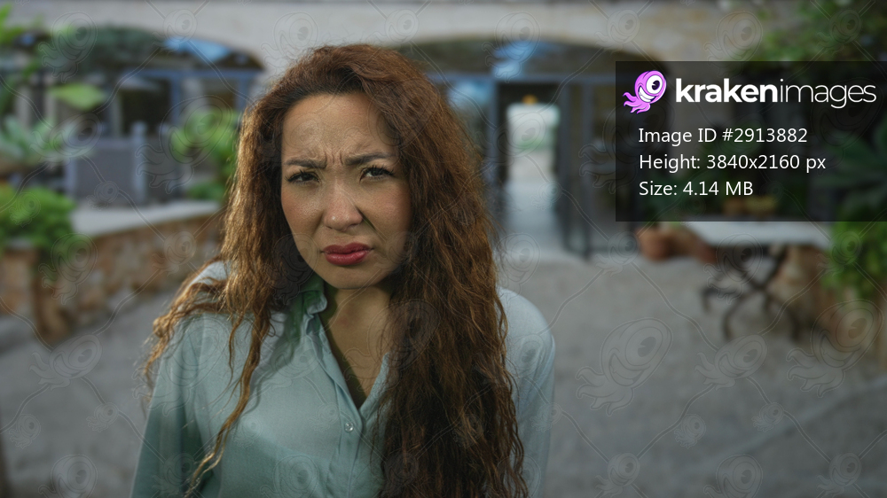 Woman frowning with furrowed brow, head tilt, long wavy brown hair and light blue shirt standing in front of building courtyard; confusion concern.