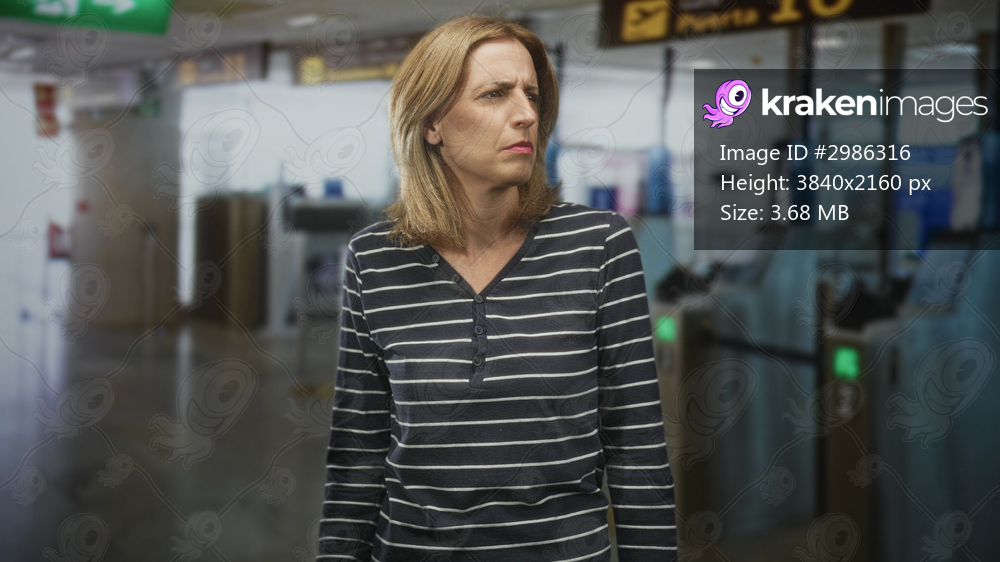 Woman frowning with hand to head at an airport check in gate, striped shirt visible and kiosks behind her; travel frustration.
