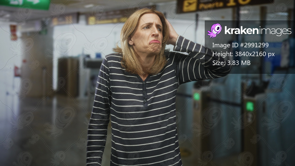 Woman frowning with hand to head at an airport check in gate, striped shirt visible and kiosks behind her; travel frustration.