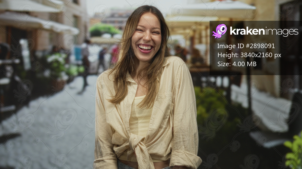 Woman frowning in a tied shirt standing on a restaurant street terrace near cafe tables and umbrellas, looking displeased; urban annoyance.