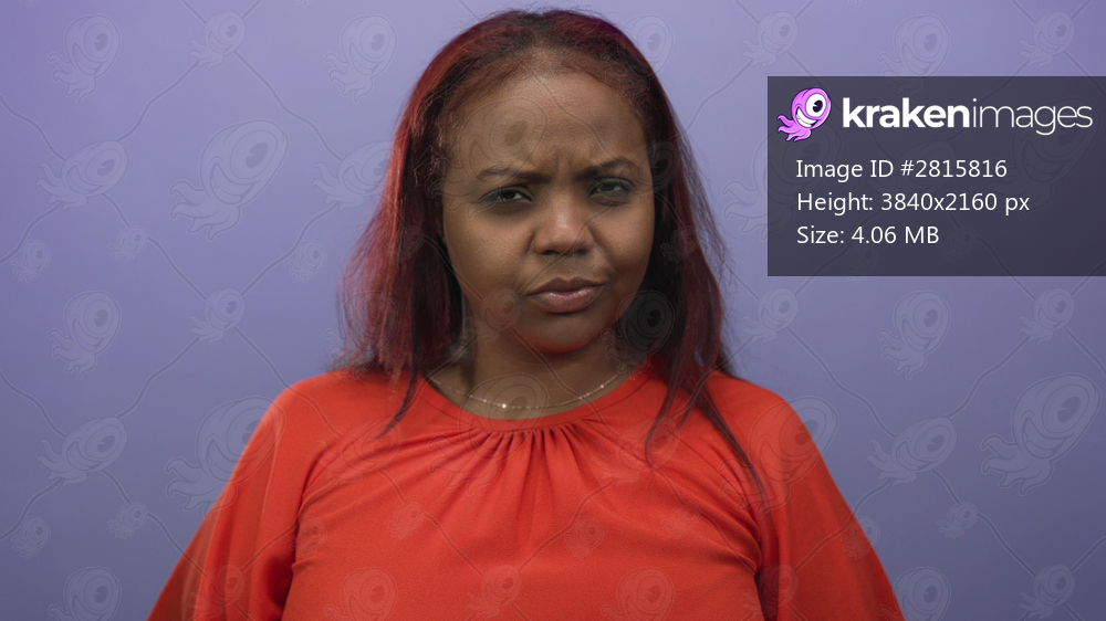 Woman frowning in studio wearing a red top and gold chain necklace under purple lighting showcasing visible facial features; concern.