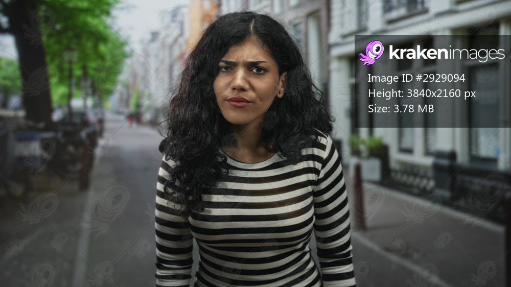 Woman frowning with nose piercing on street in city center wearing striped top beside buildings; concerned.