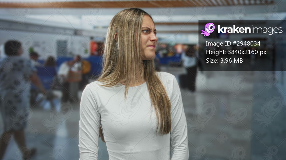 Woman frowning with scrunched face and white long sleeve top at airport terminal; annoyance travel stress.