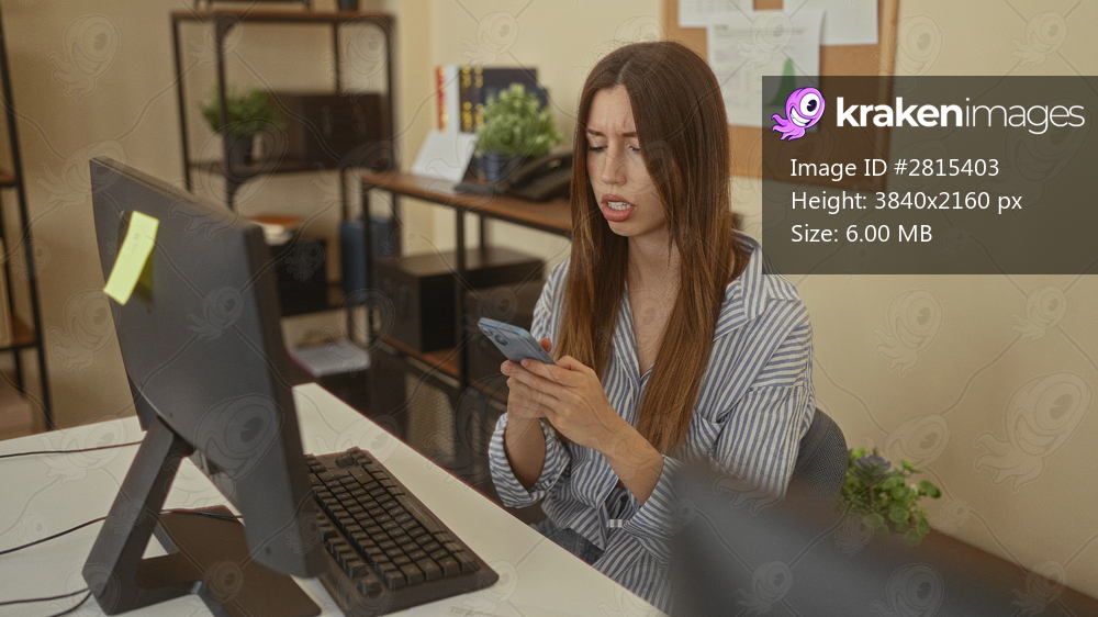 Woman frowns at smartphone while seated at a white desk with computer monitor visible in a modern office building; stress anxiety frustration tension.