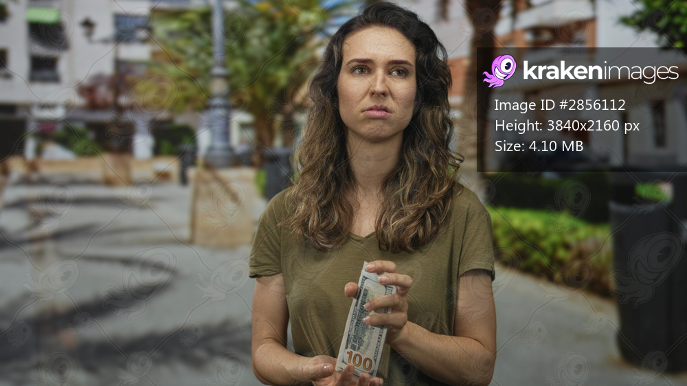 Woman frowns while flipping dollar bills and counting cash on street near modern building facade; financial worry.