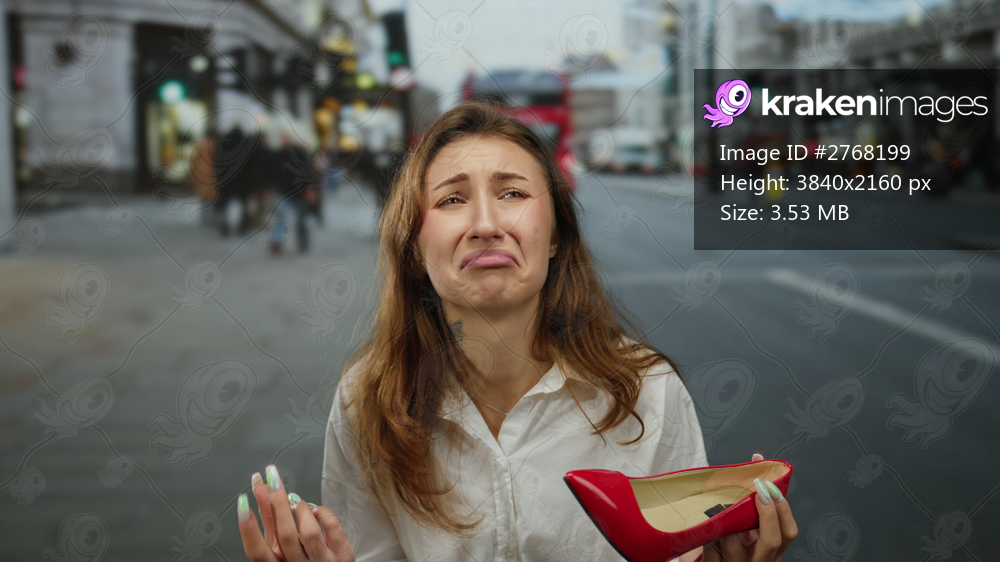 Woman frustrated with broken shoe on city street showing emotion frustration cars buildings background outdoor urban scene daytime