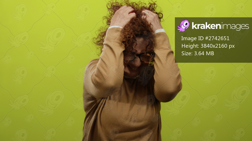 Woman frustrated on yellow background, middle aged with curly brunette hair, expressing stress wearing casual sweater and glasses, hands on head in despair. - Kraken Images