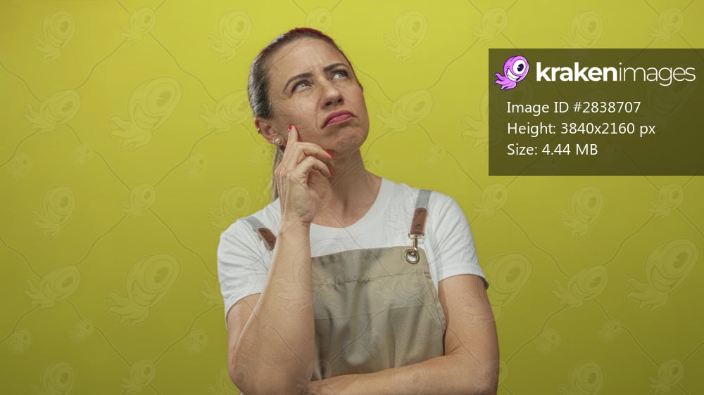 Woman with furrowed brow leaning chin on hand arms crossed looking upward in studio; thinking doubt.