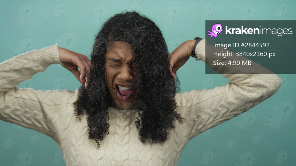 Woman furrows her eyebrows and adjusts hair against mint green wall in studio wearing cream sweater; frustration.