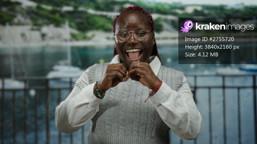 Woman gazing playfully with binocular gesture, wearing glasses, by a scenic port with boats and lush greenery, showcasing vibrant apparel and braided hairstyle. - Kraken Images