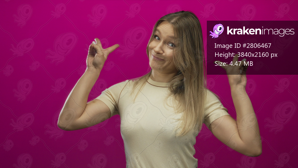 Woman gestures air quotes against vibrant pink background, expressing sarcasm with playful demeanor, blonde hair, and casual attire.