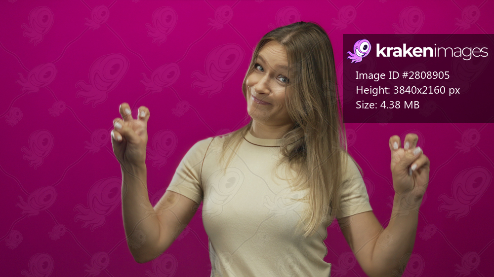 Woman gestures air quotes against vibrant pink background, expressing sarcasm with playful demeanor, blonde hair, and casual attire.