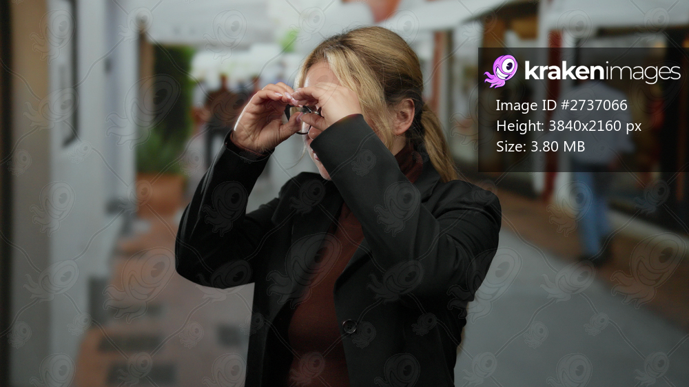 Woman gestures binoculars playfully on bustling city street wearing glasses and black coat surrounded by blurred pedestrians and shopfronts conveying vibrant urban atmosphere. - Kraken Images