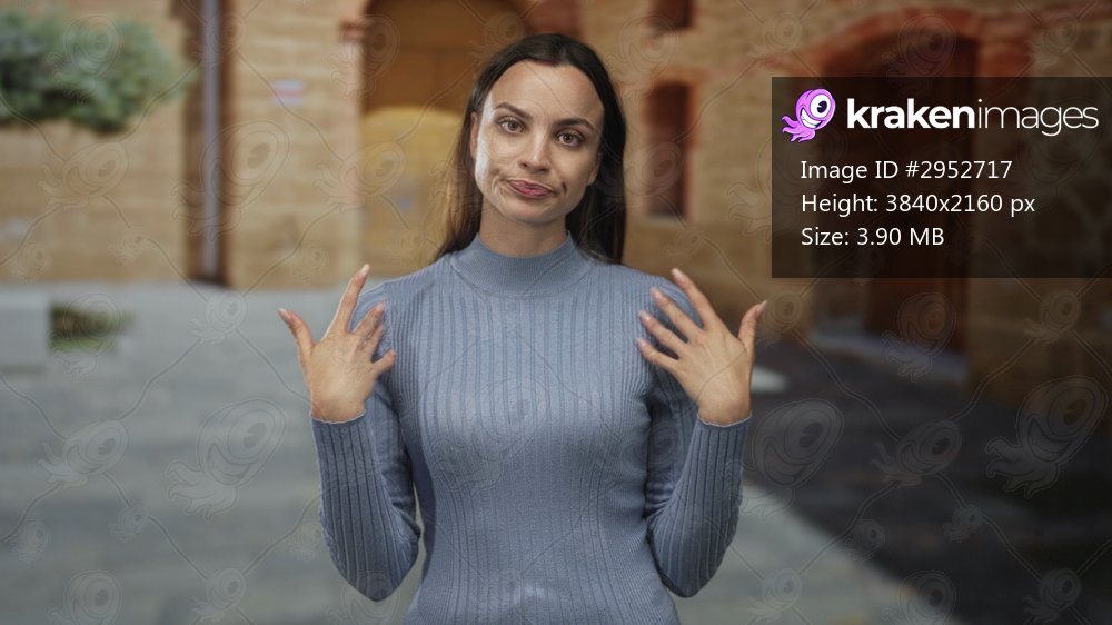 Woman gestures with both hands and visible palms in front of an old town street building, wearing a blue sweater, hands raised near chest; exasperation. - Kraken Images
