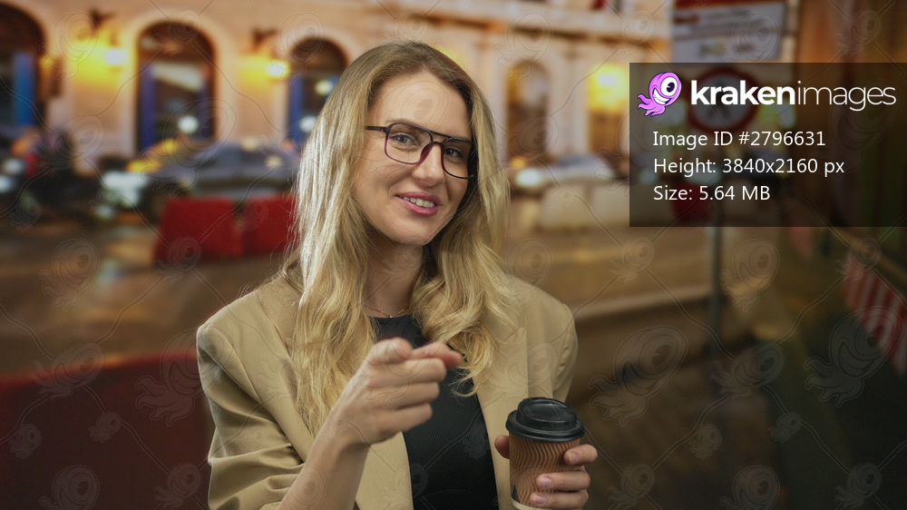 Woman gestures call me with coffee cup on city street wearing glasses and beige jacket outdoors smiling at camera urban setting