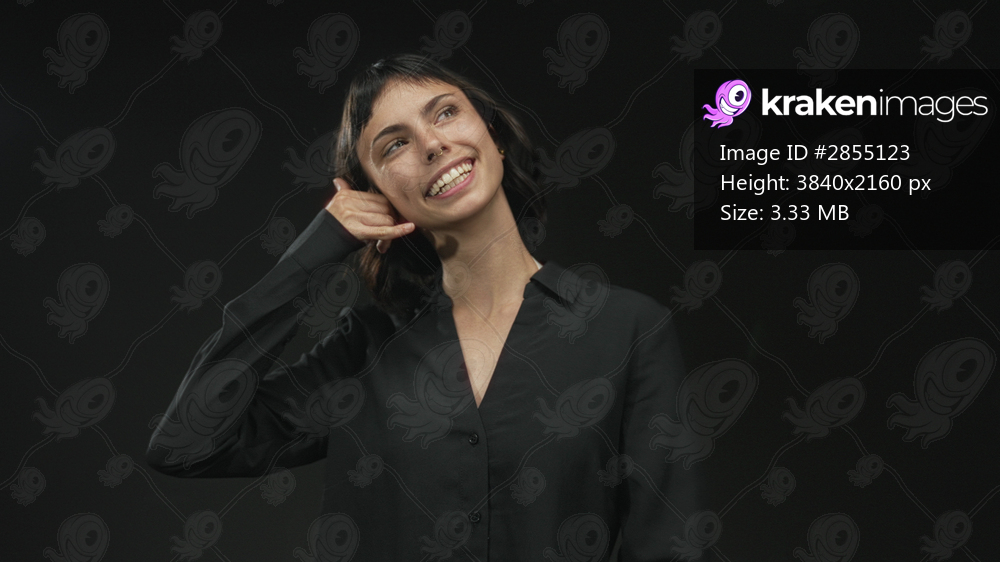 Woman gestures call me sign with hand in dark studio setting, slight smile visible on face; friendly connection.
