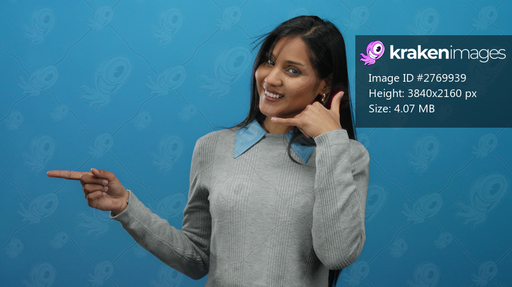 Woman gestures calling phone pointing side wearing sweater blue background smiling hispanic isolated.