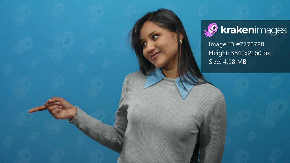 Woman gestures calling phone pointing side wearing sweater blue background smiling hispanic isolated.