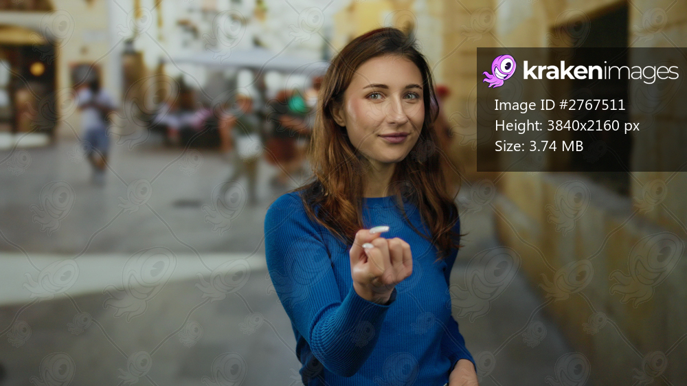 Woman gestures come with finger in urban street setting outdoors, wearing blue sweater, cityscape background, expressing emotion, young caucasian female in lively scene. - Kraken Images