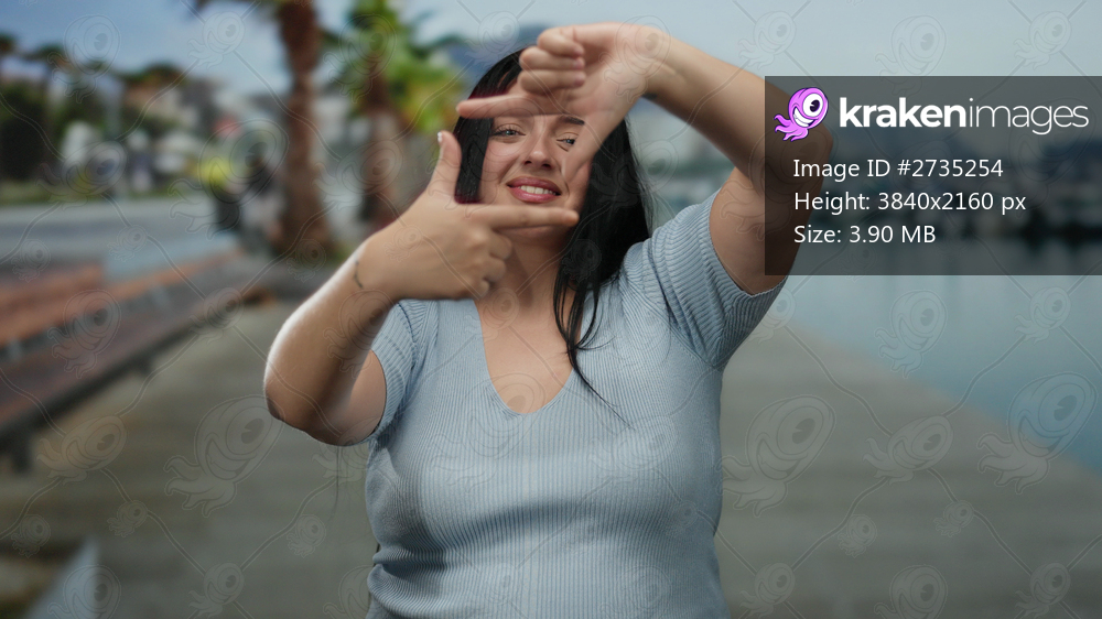 Woman gestures creatively on a seaside promenade, embracing her carefree, curvy style with a playful expression by the beach, surrounded by a serene outdoor backdrop. - Kraken Images