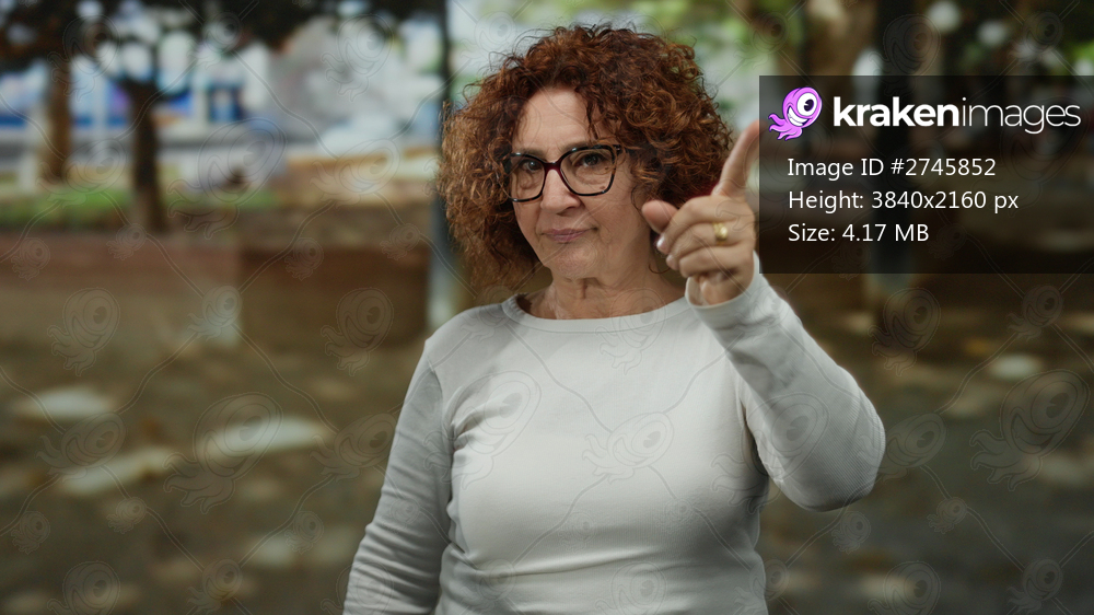 Woman gestures disapproval in park setting wearing glasses with brunette curly hair amid outdoor background suggesting a thoughtful moment during sunny day. - Kraken Images