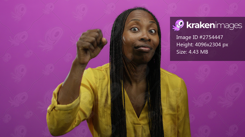 Woman gestures with expressive face against vibrant pink background wearing a yellow shirt showcasing mood and emotion with braids in an isolated studio setting. - Kraken Images
