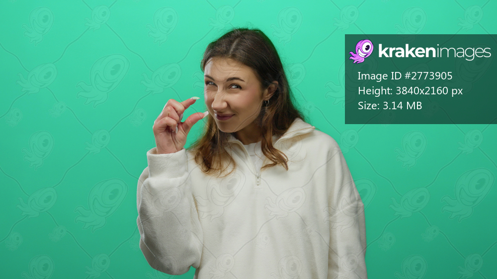 Woman gestures with fingers indicating small size against a bright green background, wearing a white sweater and showcasing a playful, expressive pose. - Kraken Images