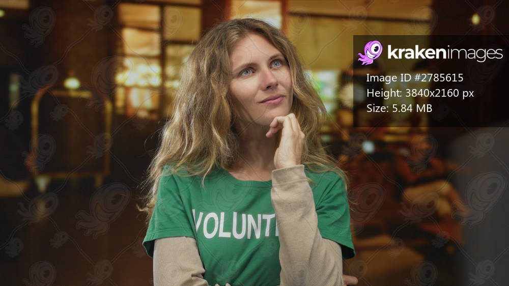 Woman gestures with hand while thinking in a cafe as a blonde young volunteer sitting for a portrait in an indoor environment.