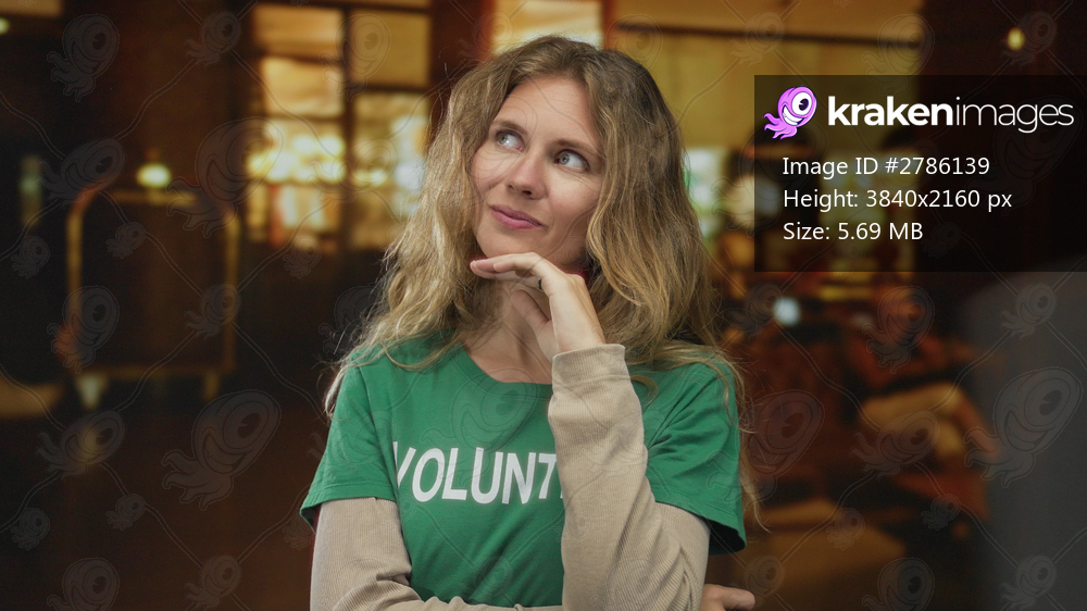 Woman gestures with hand while thinking in a cafe as a blonde young volunteer sitting for a portrait in an indoor environment.