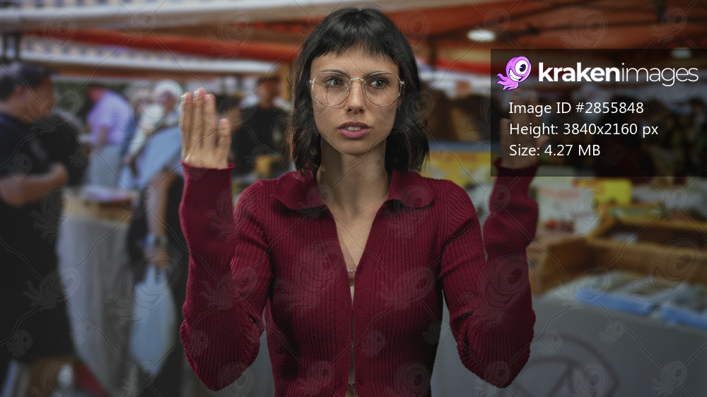 Woman gestures with hands near souvenir stall at outdoor street market while wearing red cardigan; communication.
