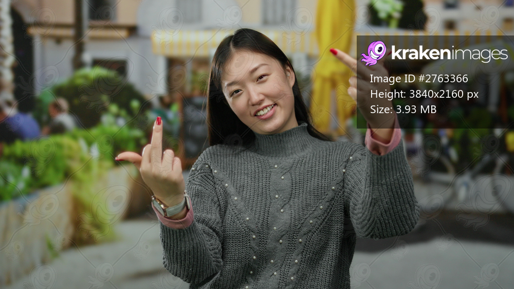 Woman gestures humorously with a playful expression outdoors in an urban setting, wearing a casual sweater, surrounded by city life and vibrant greenery, during the day. - Kraken Images