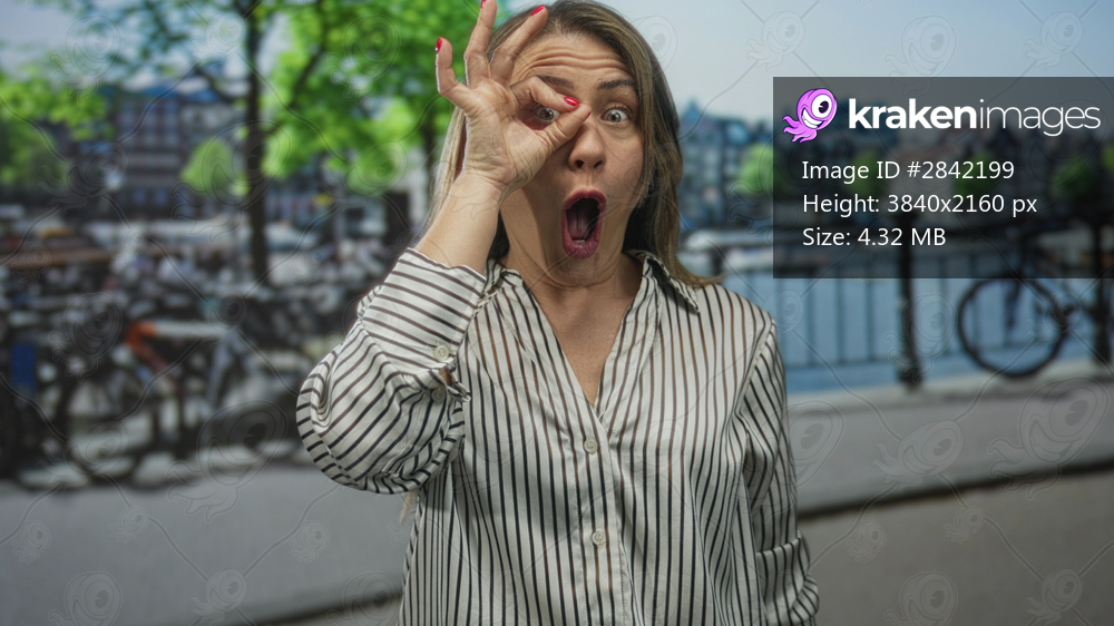 Woman gestures ok sign with hand along sunlit canal embankment on a lively bustling city street; approval.