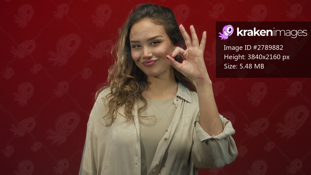 Woman gestures okay sign over isolated red background, expressing positivity and confidence in a simple beige blouse, highlighting youthfulness and natural beauty. - Kraken Images