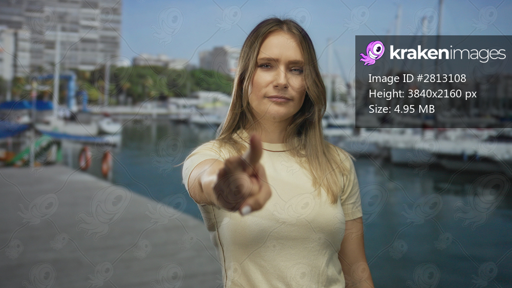 Woman gestures on a seaside boat dock with a determined expression, showcasing a dynamic and lively outdoor setting with marina background and sunny ambiance. - Kraken Images