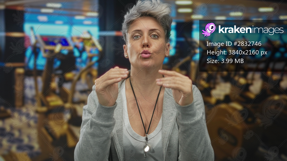 Woman gestures with open palms and holds a whistle in gymnasium while speaking with direct eye contact; motivation.