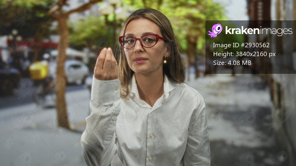 Woman gestures with raised hand and red glasses on street among parked cars and trees; confusion questioning.