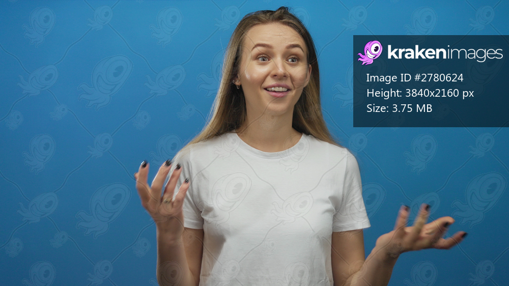Woman gestures smiling wearing white shirt against isolated blue background conveying youthful and expressive emotion.