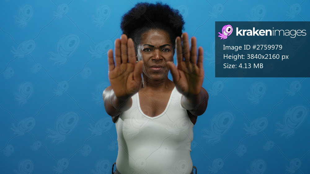Woman gestures stop with both hands in front of isolated blue background conveying concept of resistance or refusal.